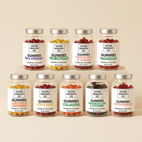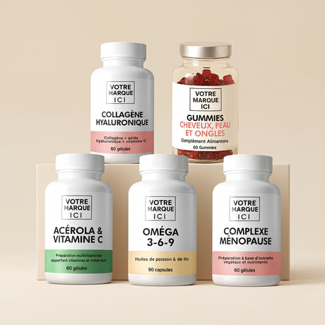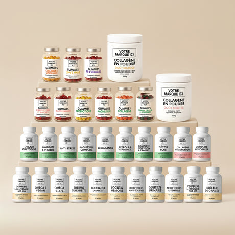 Nos formules proposées en marque blanche sont à base de plantes, vitamines et minéraux, sans colorants artificiels ajoutés (selon les références).