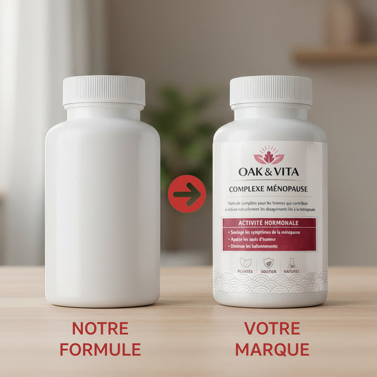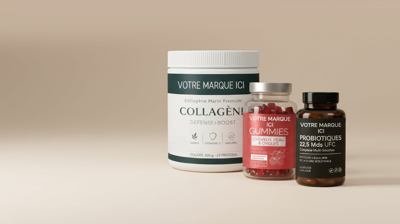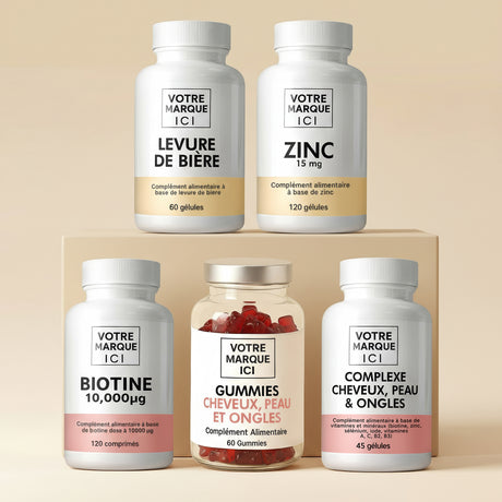 Nos formules proposées en marque blanche sont à base de plantes, vitamines et minéraux, sans colorants artificiels ajoutés (selon les références).