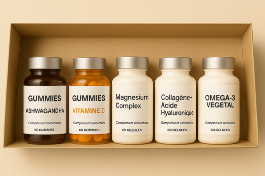 - Pilulier premium, capuchon alu, formats gummies ou gélules